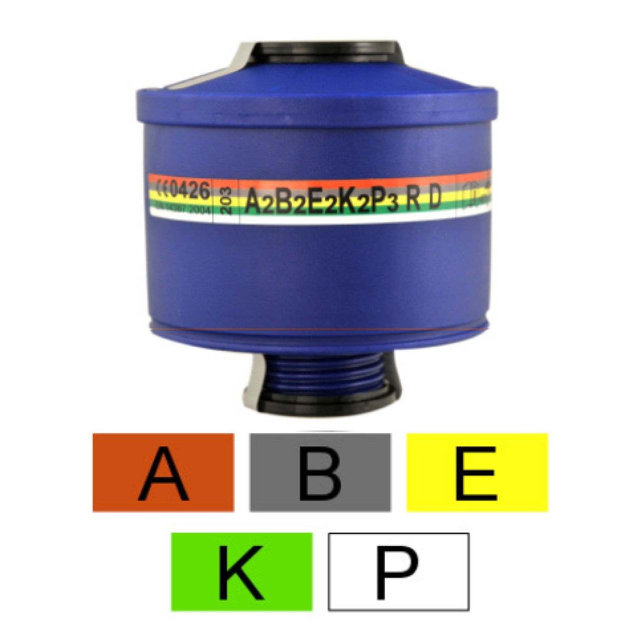 Filtro combinato a vite unificata EN 148-1 per vapori organici con punto di ebollizione superiore a 65°C, gas e vapori inorganici, Anidride Solforosa (SO2), Ammoniaca (NH3) e suoi derivati, polveri, fumi e nebbie.