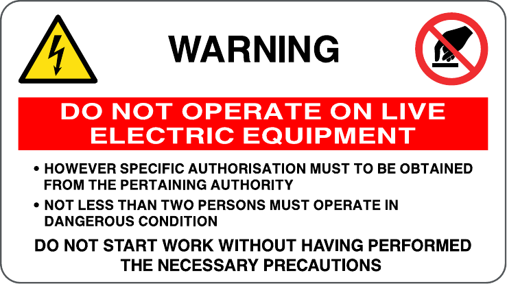 Adesivo PVC 125X70 MM WARNING DO NOT OPERATE ON LIVE ELECTRIC EQUIPMENT…