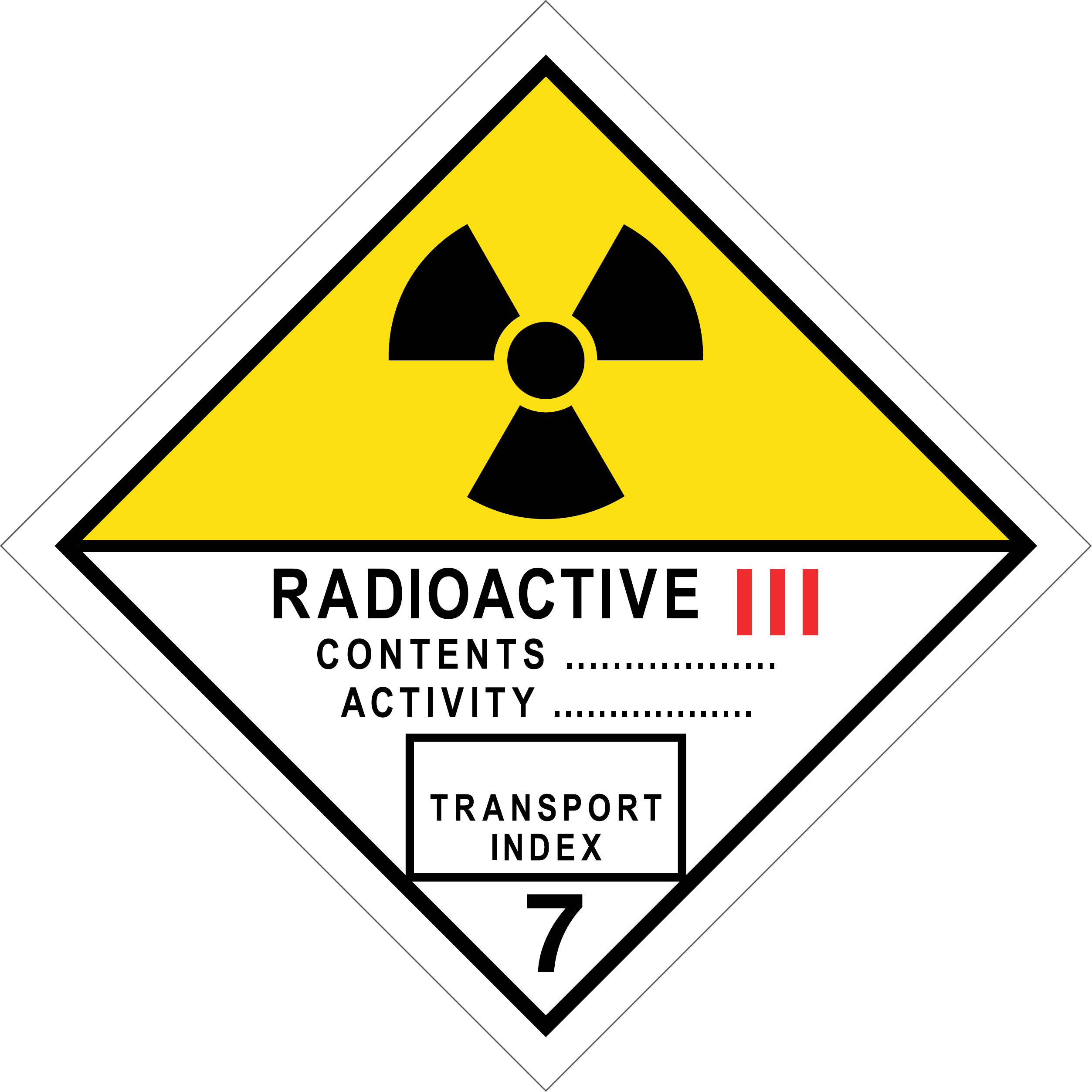 Cartello in alluminio spess. 0,7 mm. per trasporto ADR. Colore bainco/giallo con stampa nera, "radioattivo III Cl. 7".