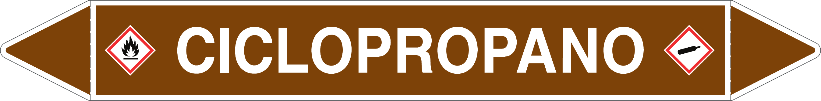 Etichetta autoadesiva per tubazioni realizzata esclusivamente in stampa digitale su PVC con film protettivo anti UV. Colore marrone con dicitura bianca.