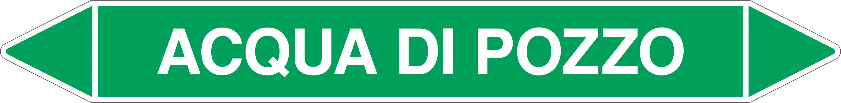 Etichetta autoadesiva per tubazioni realizzata esclusivamente in stampa digitale su PVC con film protettivo anti UV. Colore verde con dicitura bianca.
